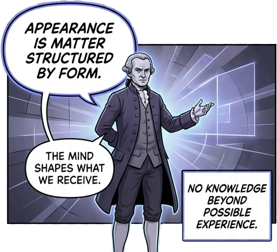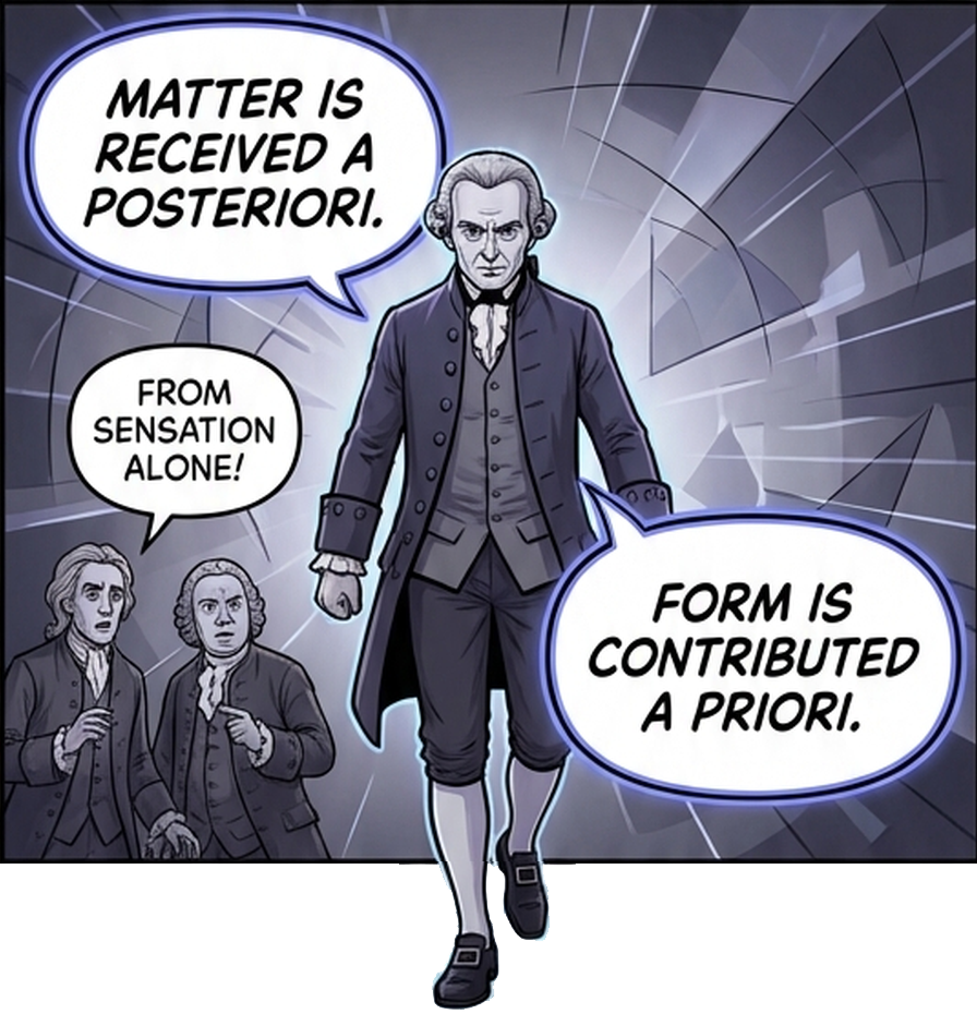 - **Matter** (*Materie*): Delivered *a posteriori* — it comes from outside, from the world affecting our senses. It is contingent; it could have been different.